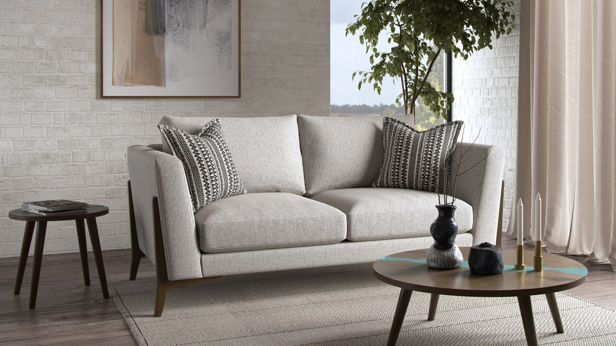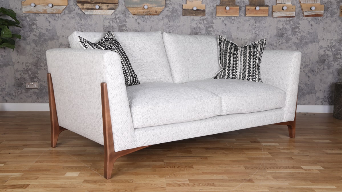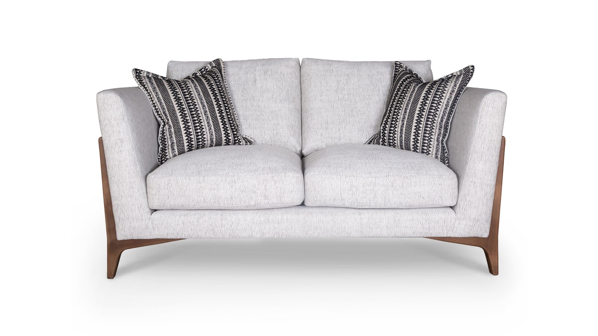 The Ren is a minimalistic 2 seater sofa with clean lines and neutral toned fabrics complemented with unique wood leg detail. Matching pillows set off this classic design.