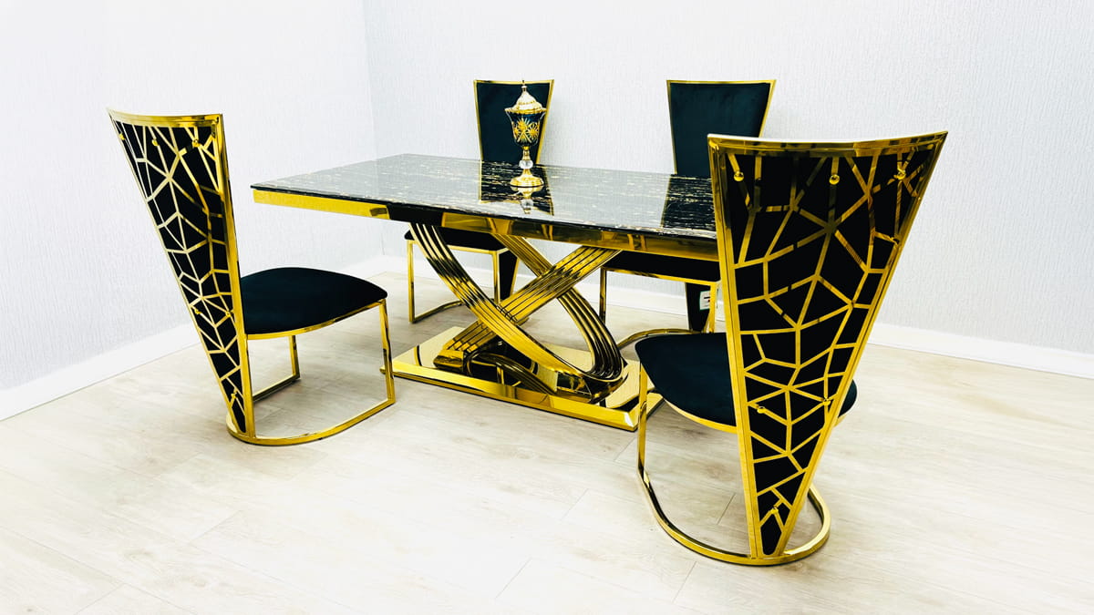 Anchored by a stunning black and gold marble-effect table, the Elina set features high-back chairs that boast intricate, geometric "spider-web" metalwork, creating a dining environment that feels like an exclusive luxury lounge.