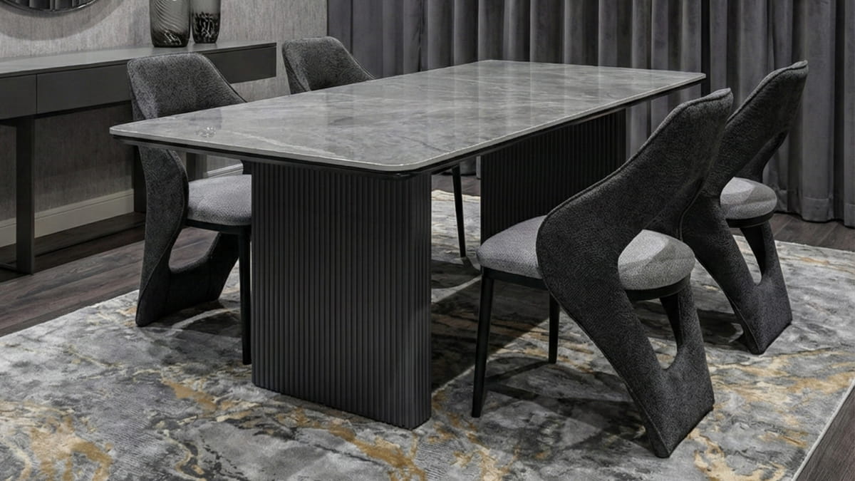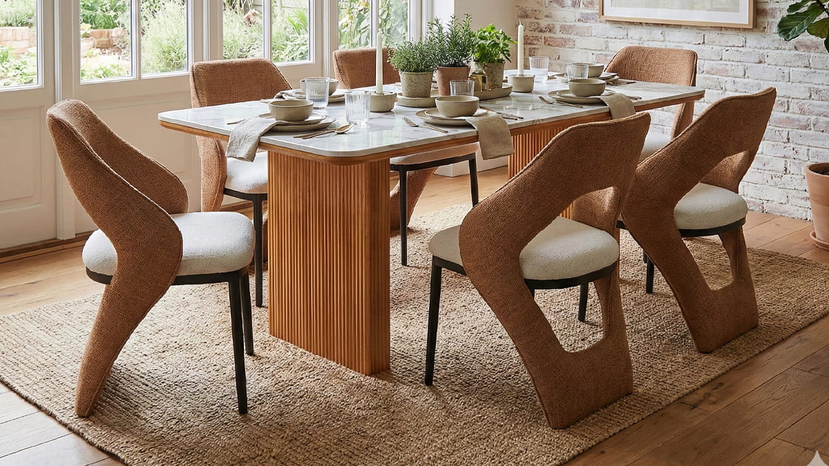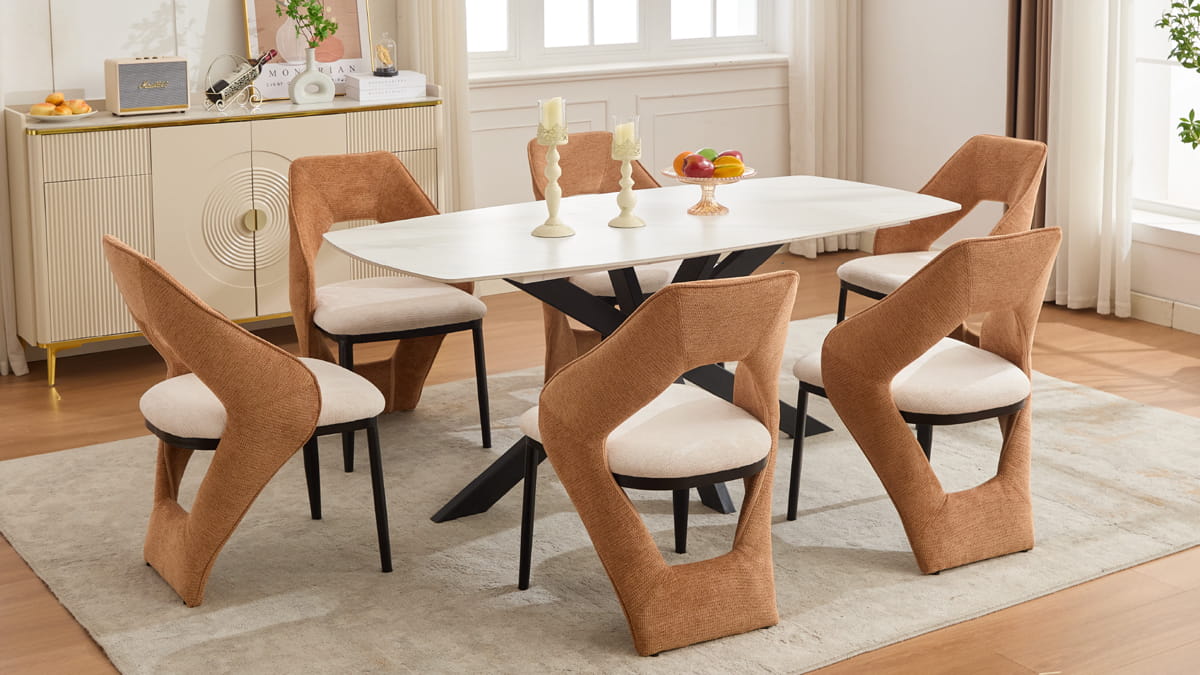 - Sculptural Cut-Out Chairs: The standout feature of this set is the uniquely designed seating. Featuring a bold, hollowed-out backrest, these chairs create a sense of lightness and architectural interest, allowing light to flow through your dining space.