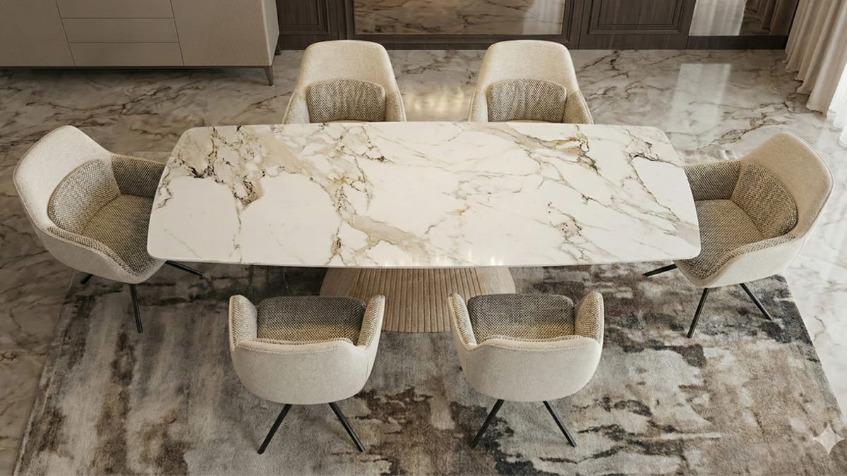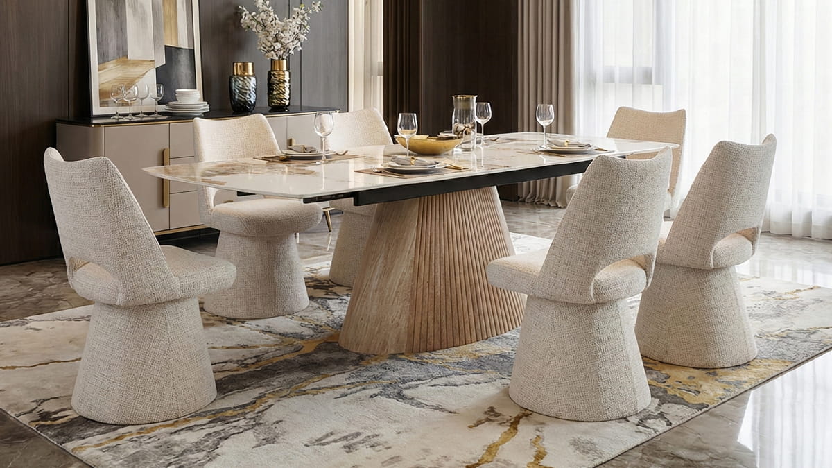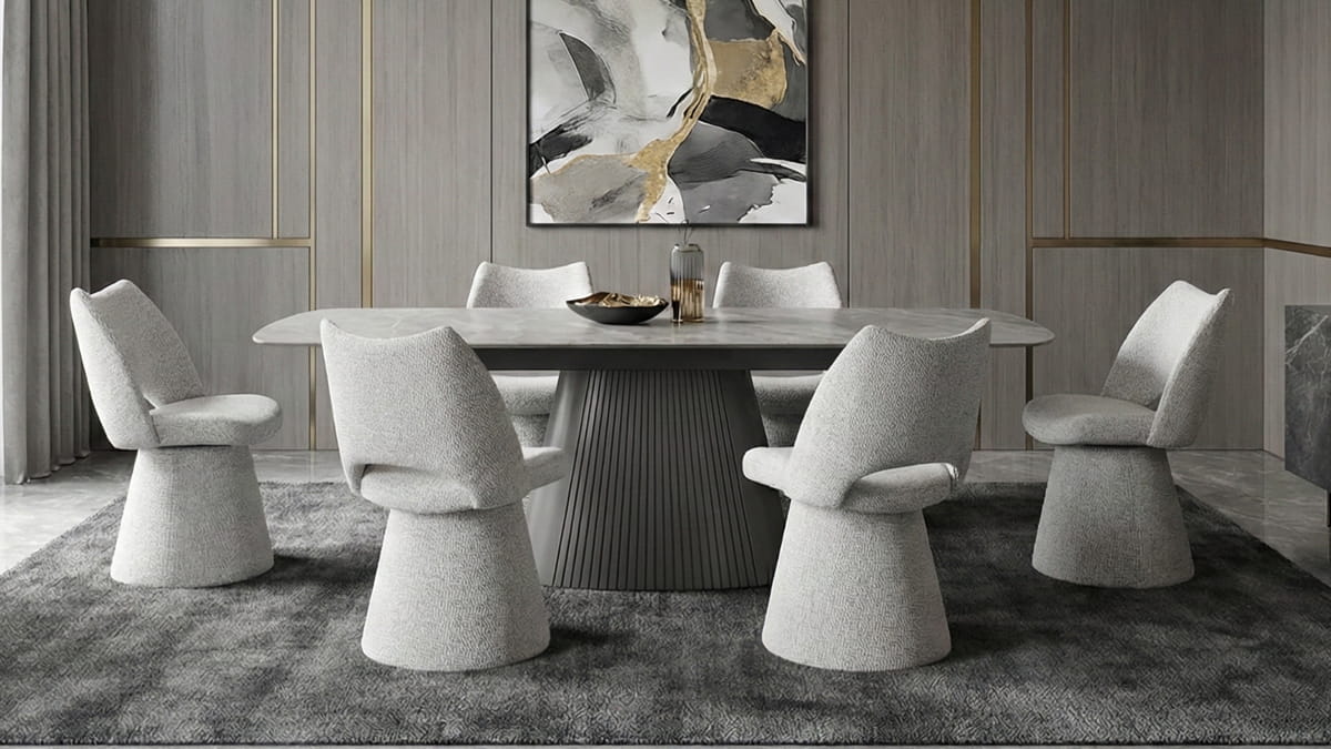 - Sintered Stone Pedestal Table: The expansive tabletop features a sophisticated grey marble-effect finish, providing a heat and scratch-resistant surface that is as practical as it is beautiful. The fluted, conical base provides rock-solid stability while serving as a stunning visual anchor.