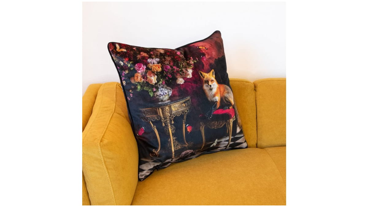 Each cushion features a striking portrait of a woodland or exotic creature, reimagined in a world of velvet armchairs, ornate side tables, and lush, botanical backdrops. Finished with elegant black piping, these are more than just cushions—they are small-scale masterpieces for your armchair, bed, or chaise longue.