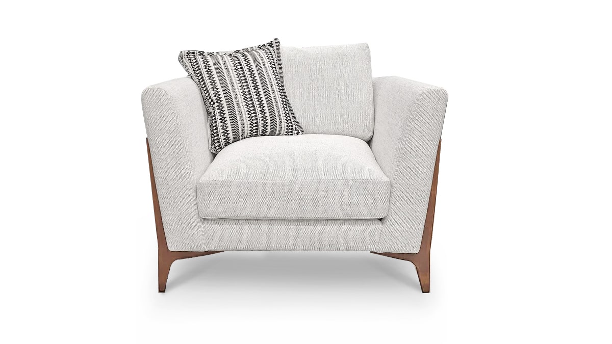 The Ren is a minimalistic fabric chair with clean lines and neutral toned fabrics complemented with unique wood leg detail. Matching pillows set off this classic design.